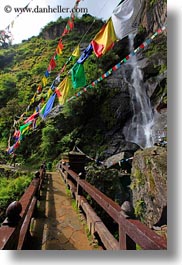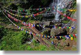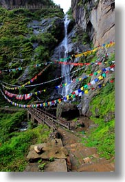 asia, bhutan, bridge, buddhist, flags, lush, nature, prayer flags, religious, vertical, water, waterfalls, photograph