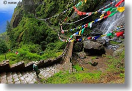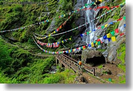 asia, bhutan, bridge, buddhist, flags, hikers, horizontal, lush, nature, prayer flags, religious, water, waterfalls, photograph