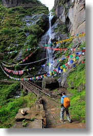 asia, bhutan, bridge, buddhist, flags, hikers, lush, nature, prayer flags, religious, vertical, water, waterfalls, photograph