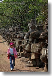 asia, cambodia, gates, girls, pink, south gate, statues, vertical, walking, photograph
