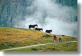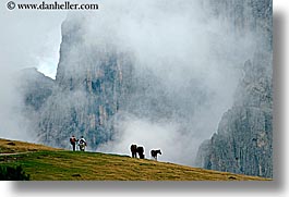 alto adige, dolomites, europe, fog, horizontal, horses, italy, rasciesa, rasciesa massif, photograph