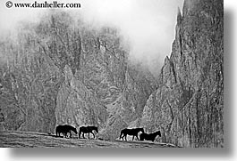 alto adige, black and white, dolomites, europe, fog, horizontal, horses, italy, rasciesa, rasciesa massif, photograph
