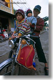asia, asian, childrens, fathers, hue, motorcycles, people, vertical, vietnam, photograph