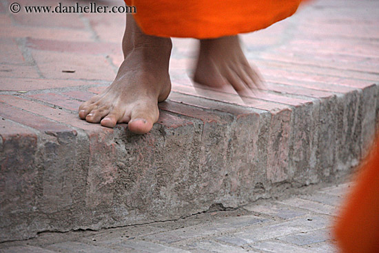 oranges, feet, bare, walking, monks, colors, people, men, luang prabang, asia, asian, laos, procession, horizontal