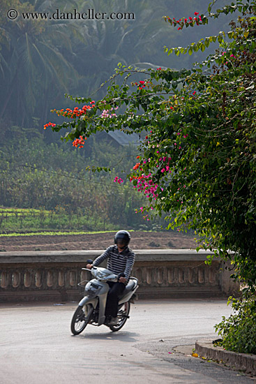 bougainvilleas, curve, bikes, vertical, luang prabang, motorcycles, asia, laos, transportation