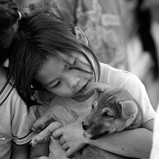 girls, river village, black and white, square format, puppies, villages, people, asia, asian, laos