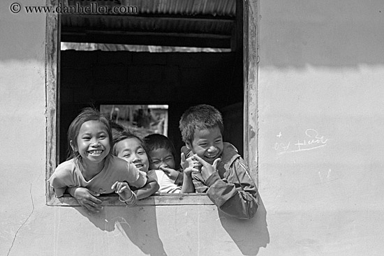 river village, emotions, childrens, black and white, windows, smiles, playing, villages, people, asia, asian, laos, laugh, horizontal