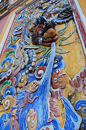 hue, bas reliefs, dragons, colorful, vertical, vietnam, asia, citadel