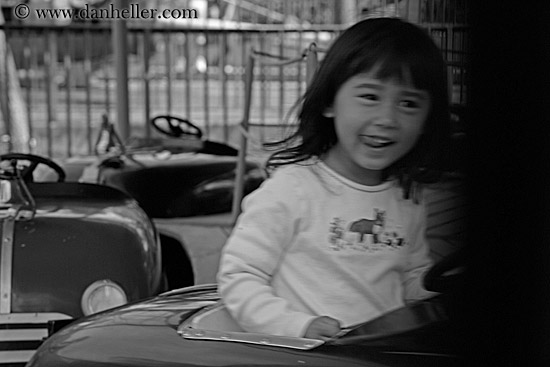 west coast, girls, amusement park ride, driving, childrens, black and white, california, western usa, people, cars, asian, oakland zoo, happy, horizontal