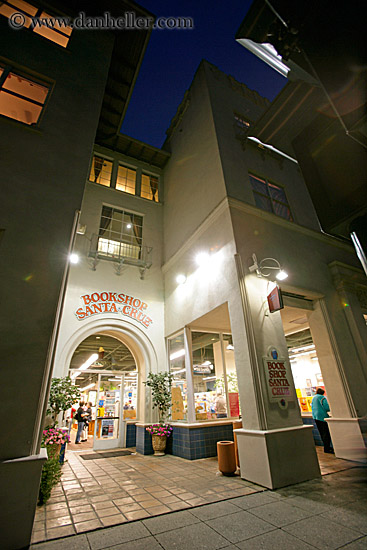 west coast, garden mall, signs, california, nite, structures, bookshop, western usa, stores, slow exposure, vertical, buildings, santa cruz