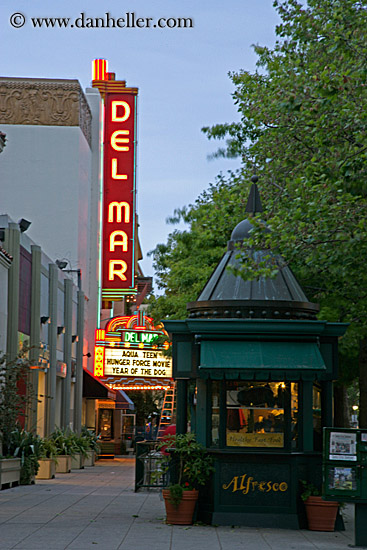 west coast, garden mall, signs, california, western usa, theater, stores, buildings, neon, trees, plants, del mar, nature, structures, vertical, long exposure, lights, santa cruz
