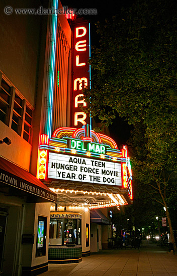 west coast, garden mall, signs, california, nite, colors, western usa, theater, stores, red, buildings, neon, del mar, structures, vertical, long exposure, lights, santa cruz