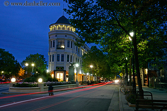 west coast, garden mall, california, nite, colors, western usa, motion blur, blues, flatiron, buildings, horizontal, trees, plants, light streaks, nature, dusk, long exposure, santa cruz