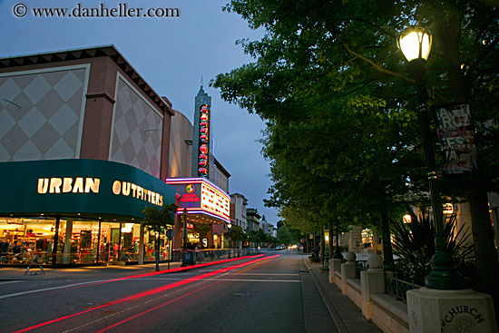 west coast, outfitters, garden mall, signs, california, nite, western usa, theater, stores, movie, motion blur, buildings, horizontal, urban, trees, plants, light streaks, structures, nature, lamp posts, long exposure, santa cruz