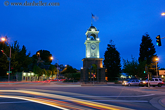 west coast, garden mall, california, nite, colors, western usa, cars, clock tower, motion blur, blues, horizontal, light streaks, streaks, dusk, long exposure, lights, santa cruz