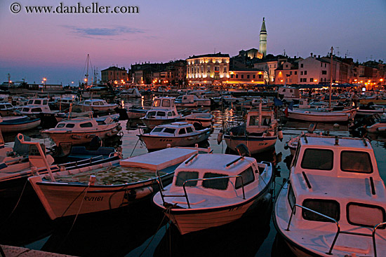 rovinj, croatia, towers, horizontal, buildings, transportation, bell towers, sky, nature, structures, glow, dusk, sun, sunsets, europe, boats, lights, harbor