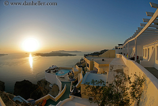 sky, hotels, greece, santorini, nature, overlooking, sun, sunsets, fisheye lens, europe, scenics, horizontal, ocean