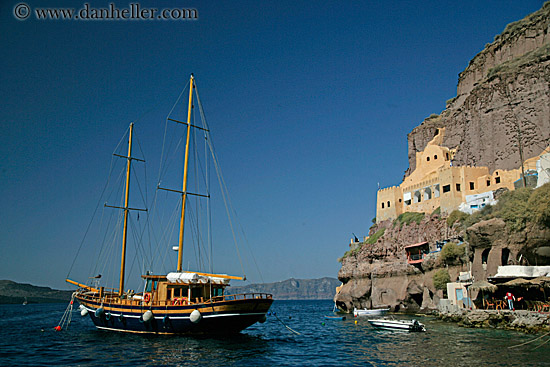 cliffs, architectural ruins, greece, santorini, europe, boats, horizontal, scenics