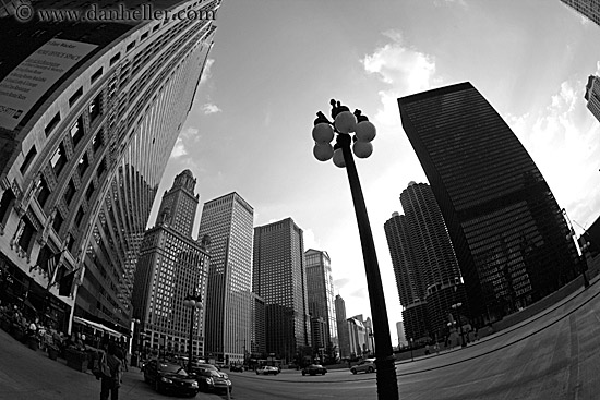streets, north america, black and white, america, united states, chicago, lamp posts, illinois, fisheye lens, horizontal, cityscapes