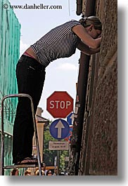 emotions, europe, humor, krakow, ladder, people, poland, vertical, womens, photograph