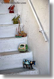 ceramics, europe, greece, mykonos, stairs, toys, vertical, white wash, photograph