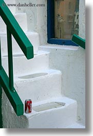 cans, coca cola, europe, greece, mykonos, stairs, vertical, white wash, photograph