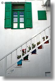 europe, greece, green, mykonos, plants, potted, stairs, vertical, white wash, windows, photograph
