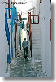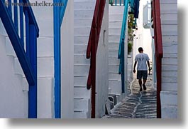 europe, greece, men, mykonos, stairs, vertical, walking, white wash, photograph