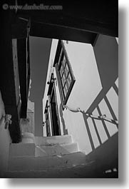 black and white, europe, greece, mykonos, stairs, upview, vertical, white wash, photograph