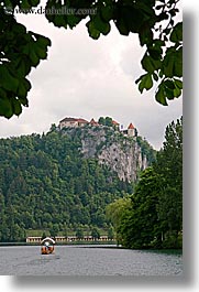 bled, boats, castles, europe, lakes, rowing, slovenia, vertical, photograph