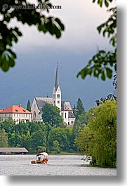 bled, boats, churches, europe, lakes, rowing, slovenia, vertical, photograph