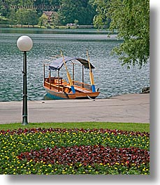 bled, boats, covered, europe, gardens, lakes, lamp posts, slovenia, vertical, photograph