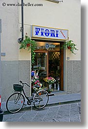 bicycles, europe, flowers, italy, scarperia, shops, towns, tuscany, vertical, photograph